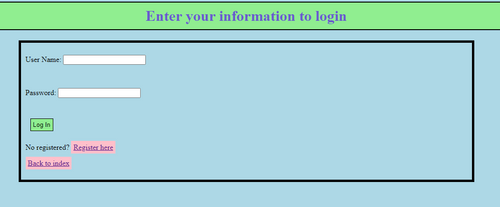 Login form for users and manager. This page also does input validation by showing an error if the user leaves the username and password fields empty or if the username and password combination is wrong.