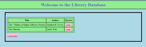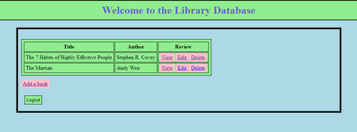 After the user logins, they see the table of books. The user can only see the reviews of a book and add a new review.