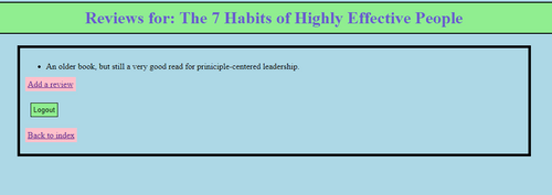 After clicking on the view link, the manager or user can view the reviews of a book. This page also shows the 'Add a review' link that can be used to add a review.