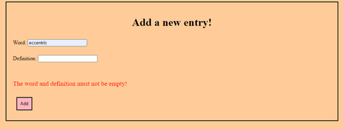 After adding an try for the word 'eccentric' and its definition, the application goes to the home page and shows the